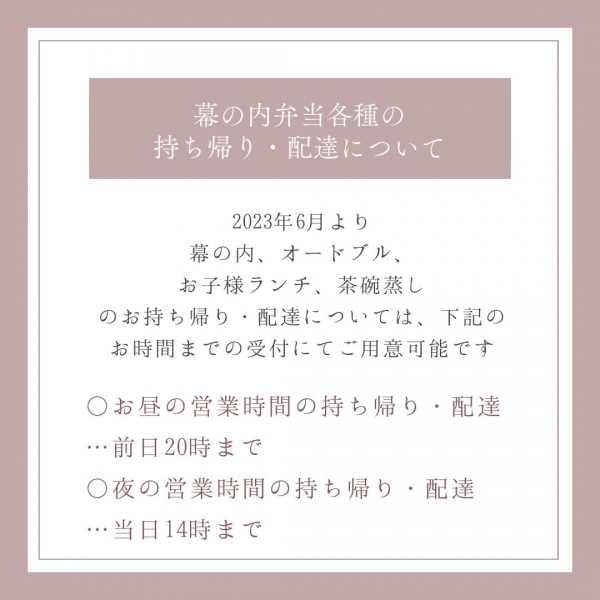 2023年6月より、仕出し出前について、ご用意可能な商品内容と受付時間の追加があります。