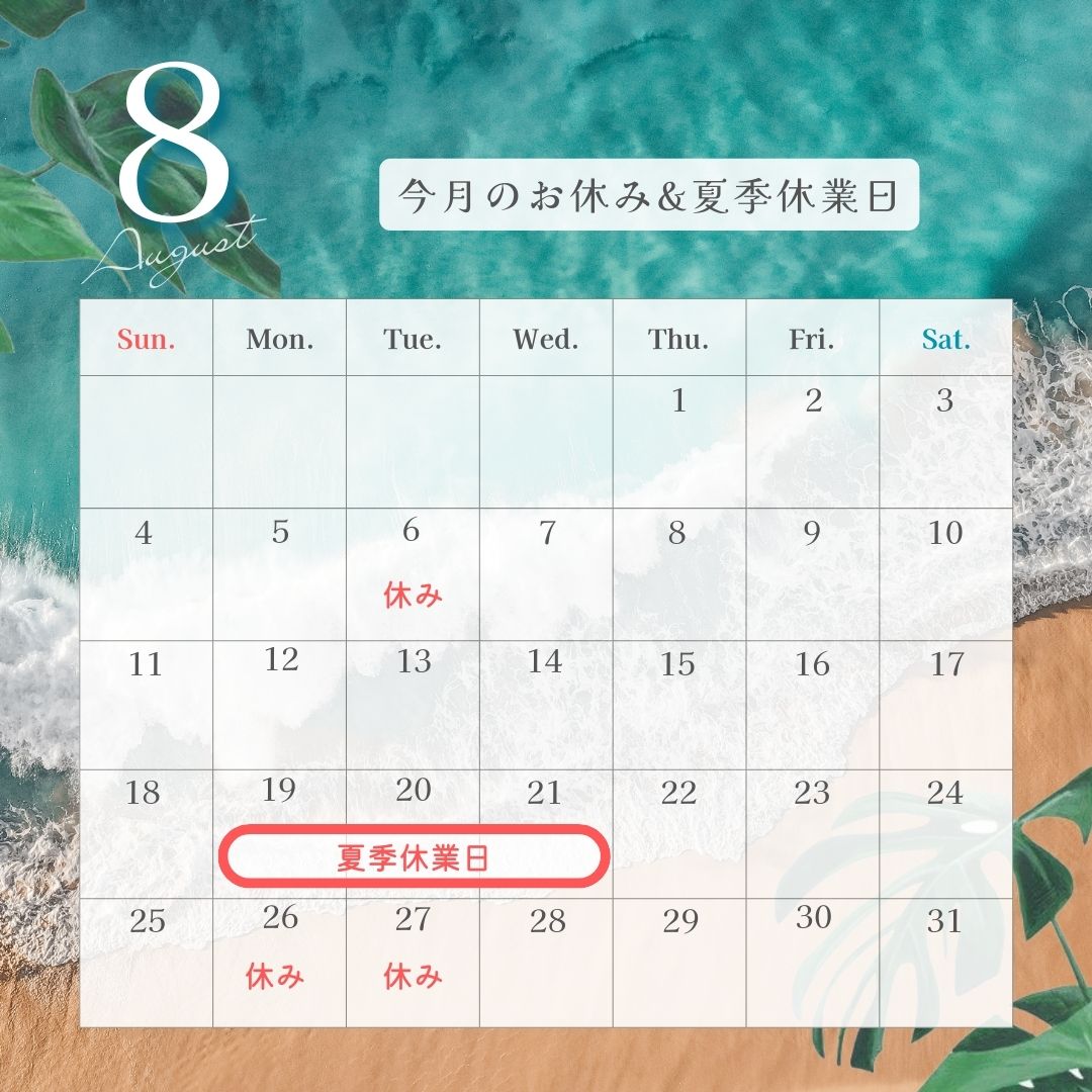 8月のお休みと夏季休業日をお知らせいたします