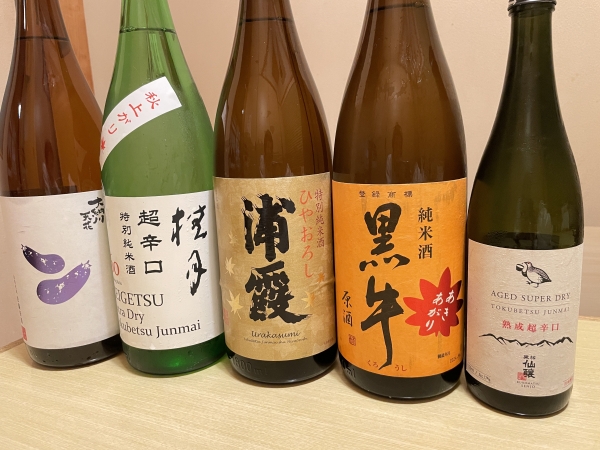 今回、当店で提供する9月の秋季限定酒は、5本すべて違う県で醸され、同じ酒米を使用しているお酒はありません。淡麗辛口、濃醇辛口、超辛口と違うタイプをご用意しました。今回は甘口はありません。当店のお料理と一緒に、ぜひ飲み比べてみてください!