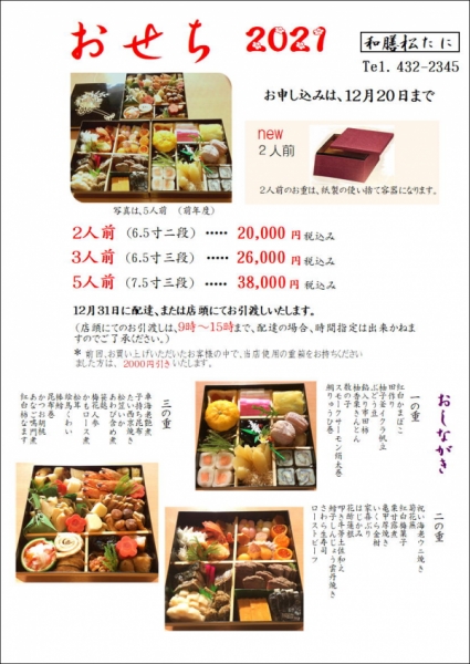2021年おせち 2020-10-22 18:02:24 2021年のおせちの受付を開始いたしました。お申し込みは12月20日までとなります。Go To Eatプレミアム付食事券もご利用いただけますので、この機会にぜひご利用くださいませ。