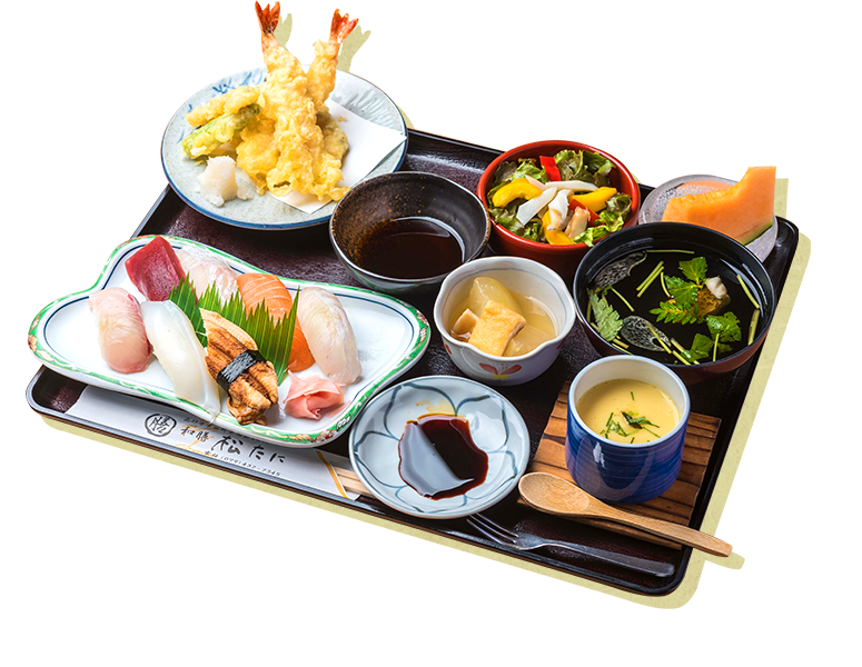お寿司7貫に、天ぷら、その他茶碗蒸しや一品がついた人気の定食です。