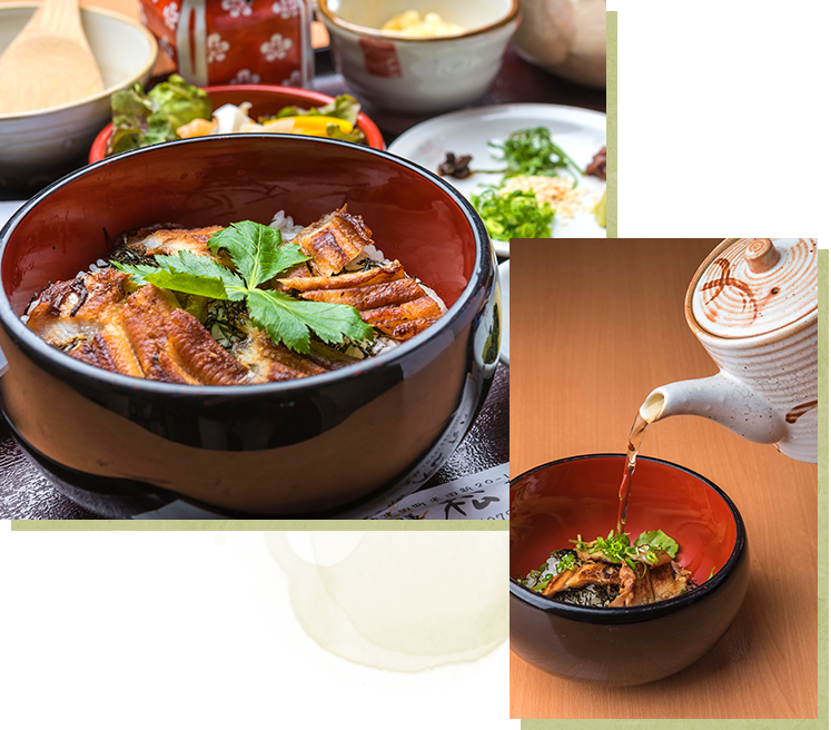 老舗・高砂下村商店さんの焼き穴子を使用した穴子ひつまぶしです。白飯の中に蒸し穴子とかんぴょうシイタケを挟んでおり、専用のタレをかけてお召し上がりいただきます。